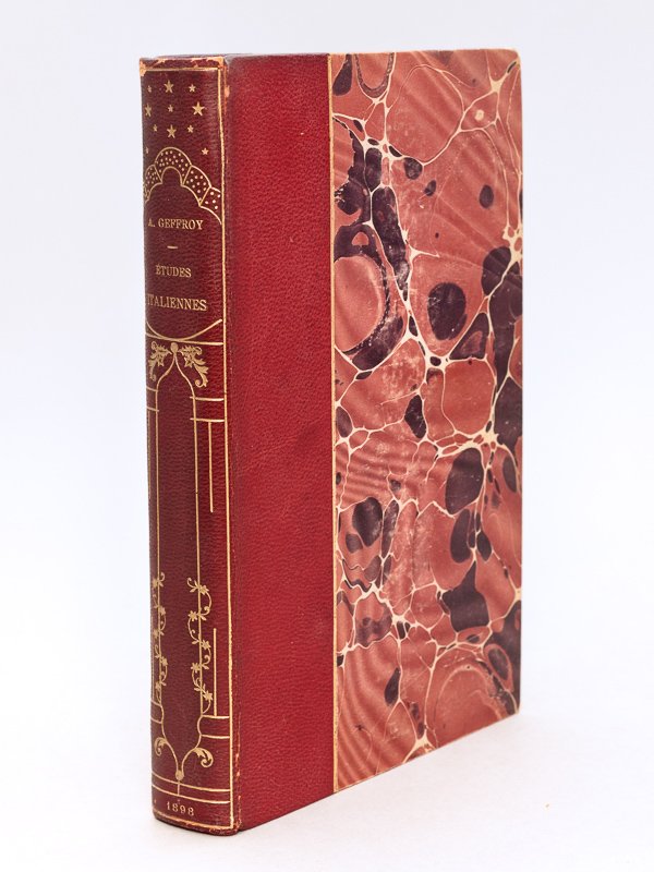 1 vol. in-12 reliure de l'époque demi-chagrin rouge, dos joliment orné en long, filet doré en mors, Armand Colin et Cie, Paris, 1898, XXII-309 pp. Jolie reliure du temps pour cette étude classique dans laquelle Geffroy évoque les grands Médicis, Savonarole, Guichardin d'après ses oeuvres inédites, Rome pendant le moyen âge et la première Renaissance, la légende de la Cenci, les collections et les collectionneurs à Rome à la fin du XVIIIe siècle, ou les Piranesi. Etat très satisfaisant (petit frott. à un mors et en coiffe sup., très bon état par ailleurs)