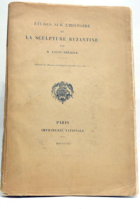 2 feuillets. 92 pages. 23 planches. 1 feuillet. (25x16,5 Cm). Broché. Couverture imprimée. Dos fendillé. Deuxième couverture postèrieure. Quelques taches et petits accrocs. Ouvrage de Louis Bréhier, spécialiste d'histoire byzantine. Il fait ici une étude détaillée de la sculpture de Byzance et de ses influences sur l'architecture religieuse en Europe. Le volume est illustré de 23 planches photographiques en noir et blanc. Tiré-à-part des Missions Scientifiques. Envoi autographe de l'auteur. Taches éparses.