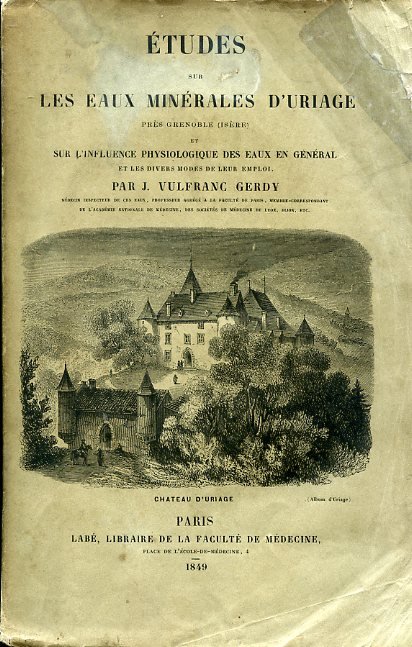 In-8°, pp. (4), XLVII, 427, brossura editoriale con vignetta raffigurante il Castello di Uriage. Antiporta litografica con veduta panoramica di Uriage. Una dedica ottocentesca. Sparse fioriture, ma ottimo esemplare in barbe e protetto da velina. Edizione originale. Indice: Considérations générales pratiques sur l'influence physiologique des eaux minérales et sur les divers modes de leur emploi. - Description de l'établissement et du pays. - Des sources minérales d'Uriage. - Influence physiologique et thérapeutique de la source sulfureuse saline d'Uriage. - Des maladies traitées par les eaux d'Uriage. Quest'ultimo capitolo tratta di tutte le affezioni curate con le acque di Uriage, dalle malattie della pelle a quelle nervose a reumatismi, ecc.<br>Maignien, III, 20574.