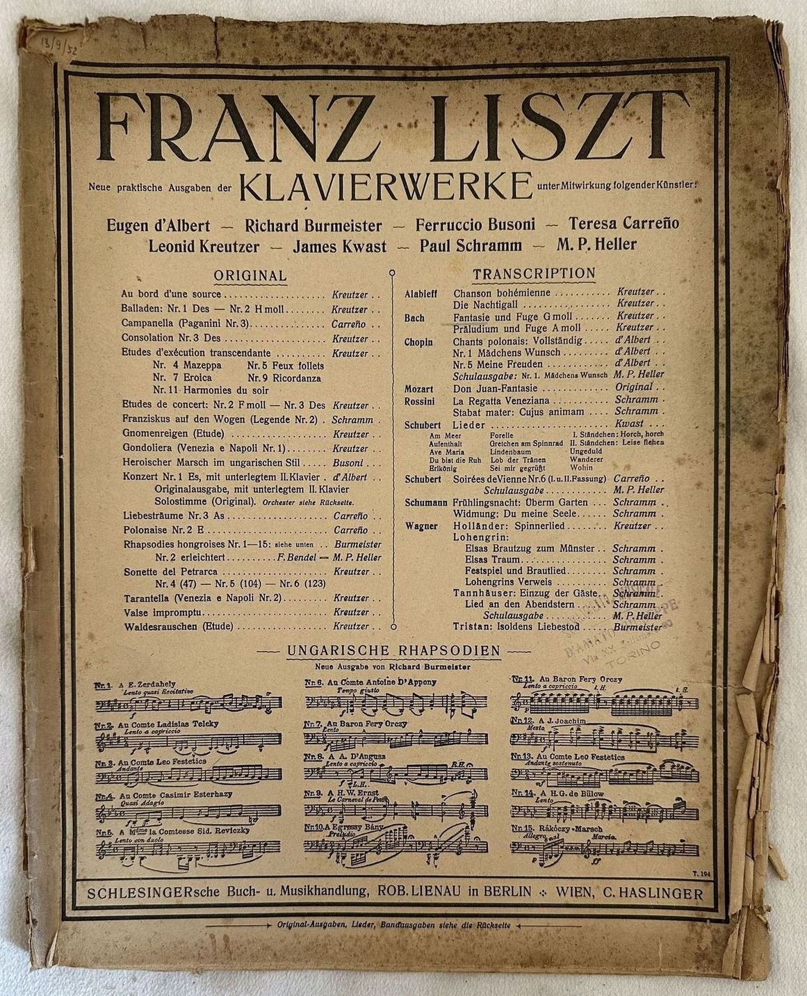 Edizione di inizio novecento della melodia "Fantasie und fuge G moll" di Johann Sebastian Bach" di Franz Liszt (1811-1886). In mediocri condizioni. Copertina editoriale in mediocri condizioni con usure e strappi marginali. Legatura in discrete condizioni. Pagine in mediocri condizioni con rare fioriture e strappi marginali. Strappo riparato a pg. 13. In 4. cm. 34x27. Pp. 19.Edition of early 20th century of the melody "Fantasie und fuge G moll" di Johann Sebastian Bach" by Franz Liszt (1811-1886). In poor conditions. Editorial cover in poor conditions lightly worn in the extremities. Binding in fair conditions. Pages in poor conditions with occasional foxing and tears in the extremities. Tear repaired in bage 13. In 4. cm. 34x27. Pp. 19.