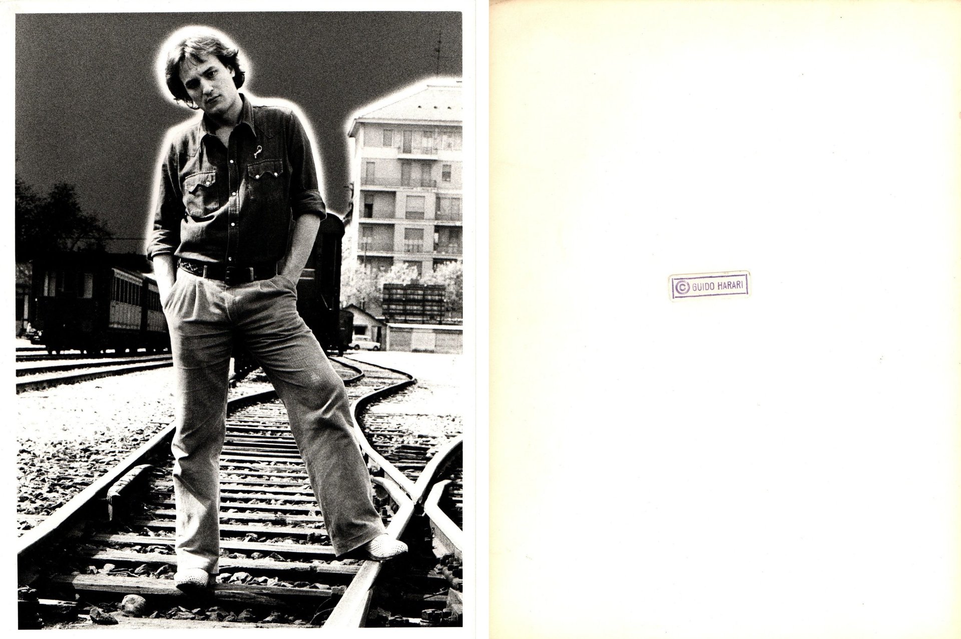 Vintage print in b/n, etichetta del fotografo applicata al verso. Guido Harari, attivo negli anni '70 come fotografo e autore delle copertine degli album dei protagonisti della musica italiana e internazionale, ritrae Eugenio Finardi probabilmente nel primo periodo della sua carriera, quando è scritturato dalla Cramps Records tra il 1975 e il 1979.
