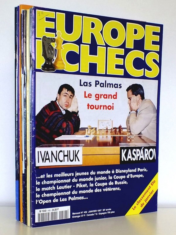 9 vol. in-4 br., couv. ill. couleurs, il. noir et blanc et qques ill. couleurs, Europe échecs, Besançon, 1997, 74 pp. par numéro Bon état (petites initiales ms. en bords de couv., bon état par ailleurs). Ensemble peu courant. Prix pour l'ensemble. Poids de 2 Kg. Au sommaire notamment : Las Palmas, le grand tournoi (Ivanchuk - Kasparov) ; le classement ELO de Janvier ; Kasparov toujours le plus fort ; Wijk an Zee : deuxième norme de GMI pour Etienne Bacrot ; Joel Lautier triomphe à Ubeda ; Etienne Bacrot, à 14 ans il est grand-maitre ; Deep Blue II, pourquoi Kasparov doit trembler ; L'humiliation ! (Kasparov perd contre Deep Blue) ; Dossier Echecs et Femmes ; Comment l'Internet révolutionne la planète échecs ; Bacrot Kortchnoi, le défi ; 72e championnat de France, le titre pour Anatoli Vaïsser