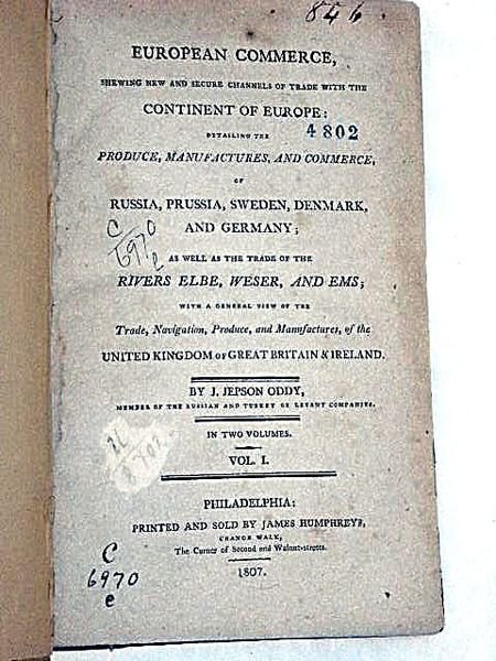 2 tomes en 2 volumes: 1). 292 pages + 2 pages non chiffrées (manque le faux-titre) 2). 328 pages (13x21cm). Cartonnage ancien. Plat supérieur du tome 1 dérelié. Papier bruni. Rousseurs. Déchirure p. 207 à 217 au tome 1, sans manque. Mouillure dans la marge inférieur des derniers feuillets du tome 1. Cachets et écritures aux pages de titre. Rare Edition Américaine. America. Commerce. Economie. Europe. Livre en Anglais.