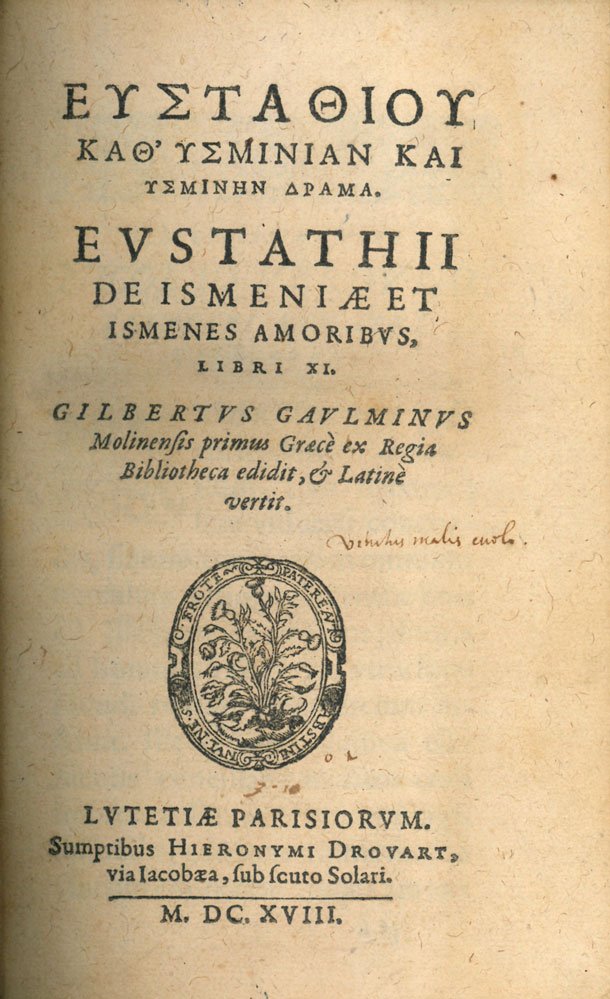 Eustathiou Kath'Ysminian kai Ysminen drama. Eustathii de Ismeniæ et Ismenes amoribus libri XI. Gilbertus Gaulminus Molinensis primus Græcè ex regia bibliotheca edidit, et Latine vertit