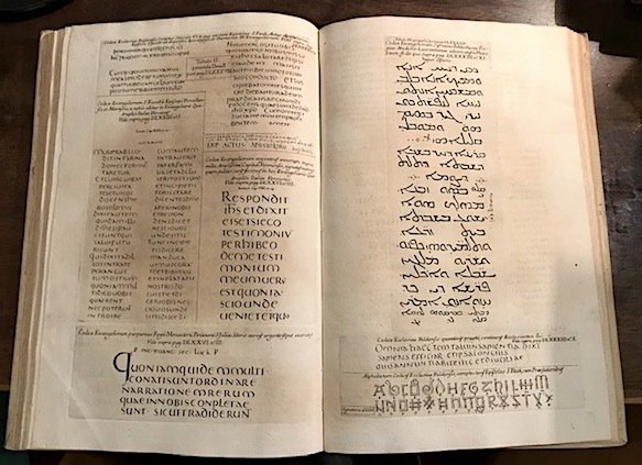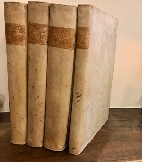 Folio (cm. 42), 4 Voll. Opera completa con collazione conforme a ICCU. Con illustrazioni calcografiche n.t. (anche a piena pagina) e complessive 19 tavv. f.t. (di cui quattro ripiegate). Frontespizi stampati in rosso e nero. Iniziali e fregi. Legature coeve in pergamena rigida con titolo oro su tassello dipinto al ds. (lievi difetti marginali e qualche piccola macchia). Alcune carte brunite ma, nel complesso, esemplare in ottimo stato di conservazione. Le tavole sono riproduzioni in facsimile dei codici manoscritti in latino, greco, copto, aramaico, ecc. Rara opera. Brunet II, 1118.