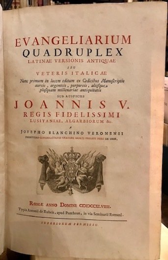 Evangeliarium quadruplex latinae versionis antiquae seu veteris italicae. Nunc primum in lucem editum ex Codicibus Manuscriptis aureis, argenteis, purpureis, aliisque plusquam millenarias antiquitatis.