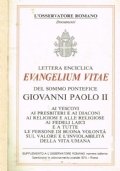 192 pagine. BUONE CONDIZIONI. Supplemento a L'Osservatore Romano. Pubblicato nel 1995 da Giovanni Paolo II, il documento si rivolge ad ogni uomo e donna di buona volontà e tratta del valore e dell'inviolabilità della vita umana. Si va dalle minacce alla vita umana, al messaggio cristiano sulla vita, dal non uccidere a una nuova cultura della vita umana. Nell'introduzione un appassionato appello del Papa: "Rispetta, difendi, ama e servi la vita, ogni vita umana! Solo su questa strada troverai giustizia, svil