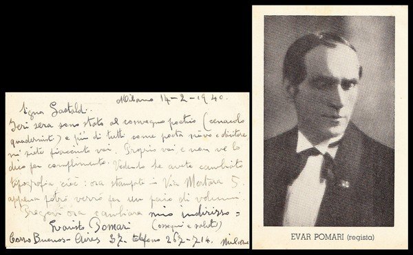 Evaristo Evar Pomari. Regista. cartoncino fotografico manoscritto e firmato