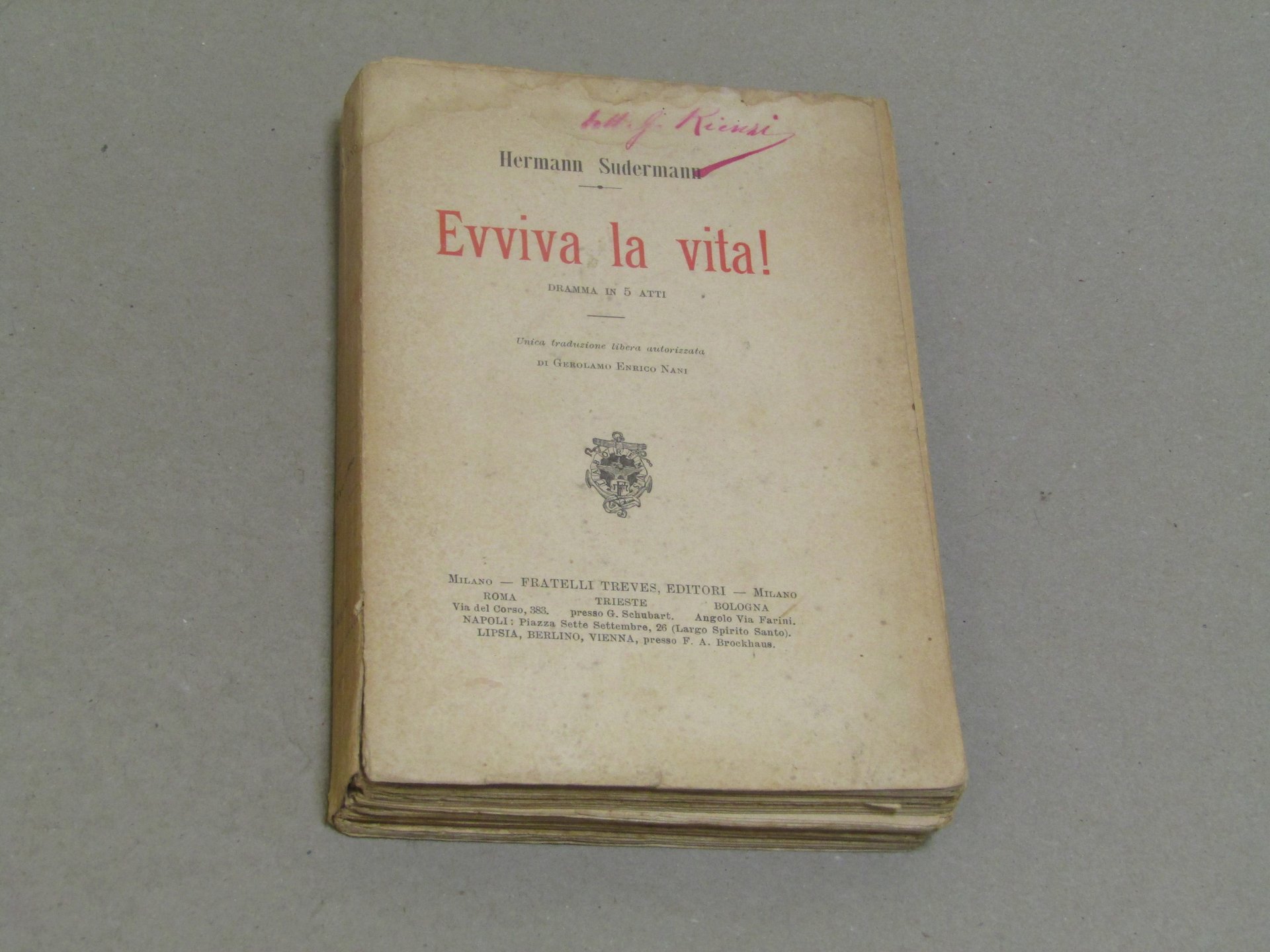 Hermann Sudermann Evviva la vita!. Milano, Fratelli Treves 1902 italiano, 19,5 13 pp. 307 Dramma in 5 atti.