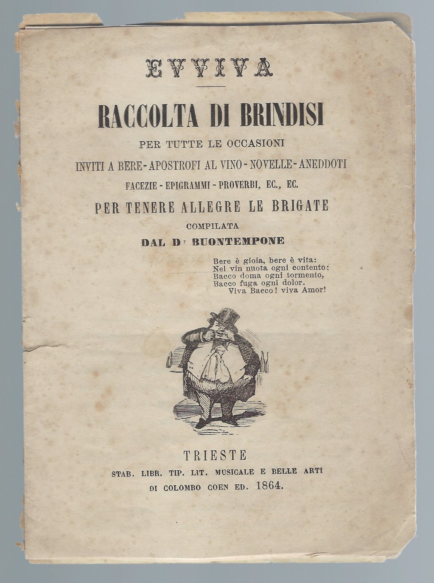 Primo fascicolo di questa spiritosa raccolta di " Inviti a bere - apostrofi al vino - novelle - aneddoti facezie - epigrammi - proverbi, ecc. "