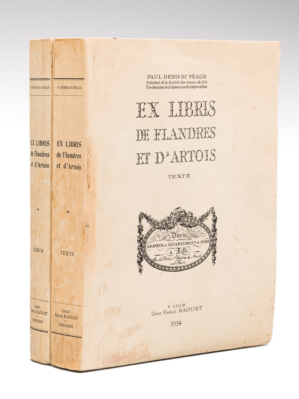Tirage à 300 exemplaires sur Lafuma numérotés (n° 149), 2 vol. in-4 br. sous couv. parcheminée rempliée, Chez Emile Raoust, A Lille, 1934, VII-309 pp. et 200 planches Cet ouvrage peu commun réunit un volume de texte, répertoriant 1359 ex-libris, et un album reproduisant 857 ex-libris en 200 planches. Etat satisfaisant (fortes mouill. dans l'album avec plusieurs planches anciennement contrecollées, bon état par ailleurs). Prix en l'état pour cet ouvrage de référence.