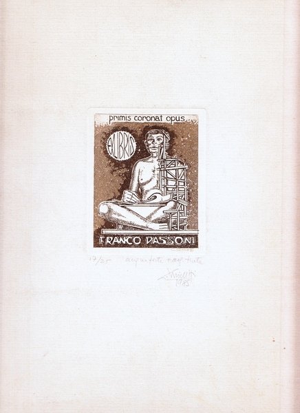 ex libris di Franco Passoni illustrato da G. Michetti firmato da quest'ultimo in edizione numerata, di 25 ess. ns. num. 17; ex libri su cartoncino formato 24,5X35 cm circa; buon es.
