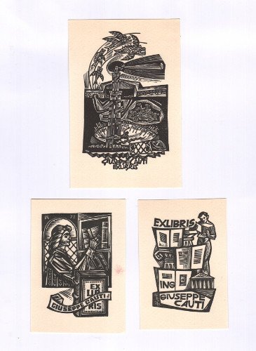 3 Ex libris originali Giuseppe Cauti. Xilografie di: Tranquillo Marangoni - Italia (mm 142x95), Fery Antal - Ungheria (mm 112x80), Oriol Divi - Spagna (mm 110x75)