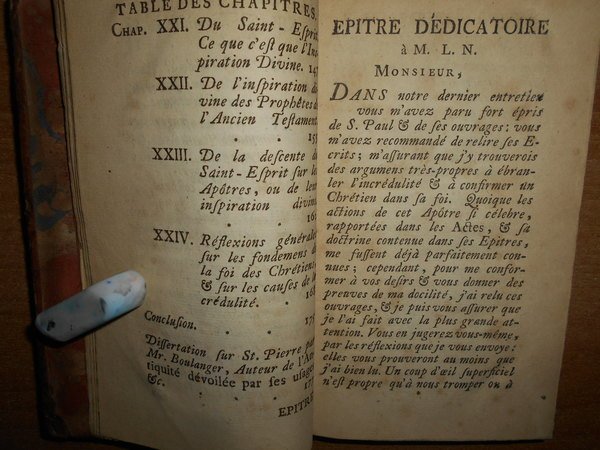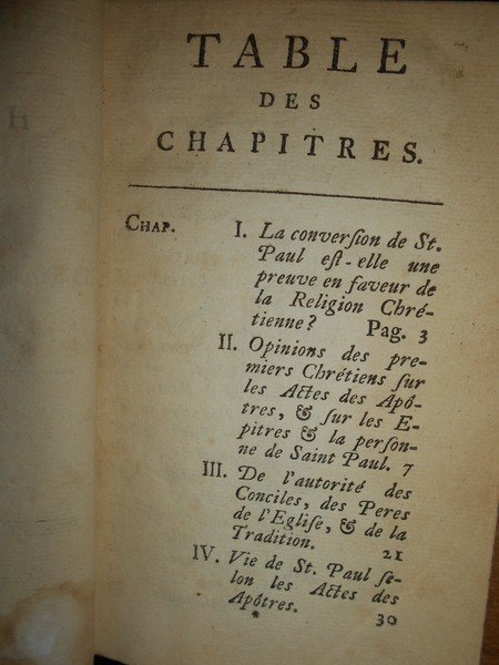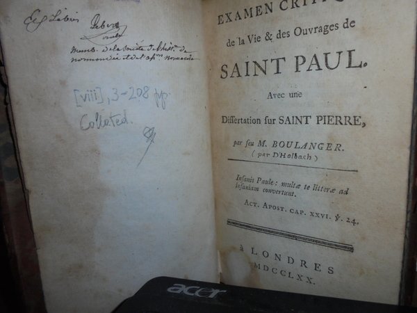 par feu M. Boulanger (par D' Holbach). Londres, 1770. EXAMEN critique de la Vie & des Ouvrages de SAINT PAUL. Edizione originale. In-12°, piena pelle coeva con fregi e titolo in oro al dorso. viii, 3-208 pp. Casa mob. grande