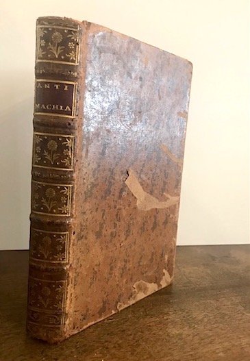 8vo (cm. 19,5), XX pp., 2 cc.nn., 335(1) pp. Graziosa vignetta calcografica al frontespizio sottoscritta Chovin (Minerva e Mercurio con tre putti alati in una biblioteca. Sullo sfondo una nave. Motto su cartiglio ‘utroque favente’). Testo su due colonne. Legatura coeva in piena pelle con nervi, ricchi fregi e titolo oro su tassello al ds. (abrasioni ai piatti e tracce d’usura marginali). Tagli rossi. Due ex libris di collezioni private al contropiatto anteriore. Esemplare in buono stato di conservazione. La redazione dell’opera fu curata da Voltaire ed il testo a fronte de ‘Il Principe’ è nella traduzione francese di Abraham Amelot de la Houssaye.
