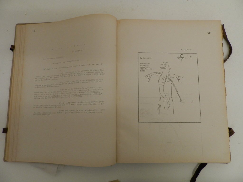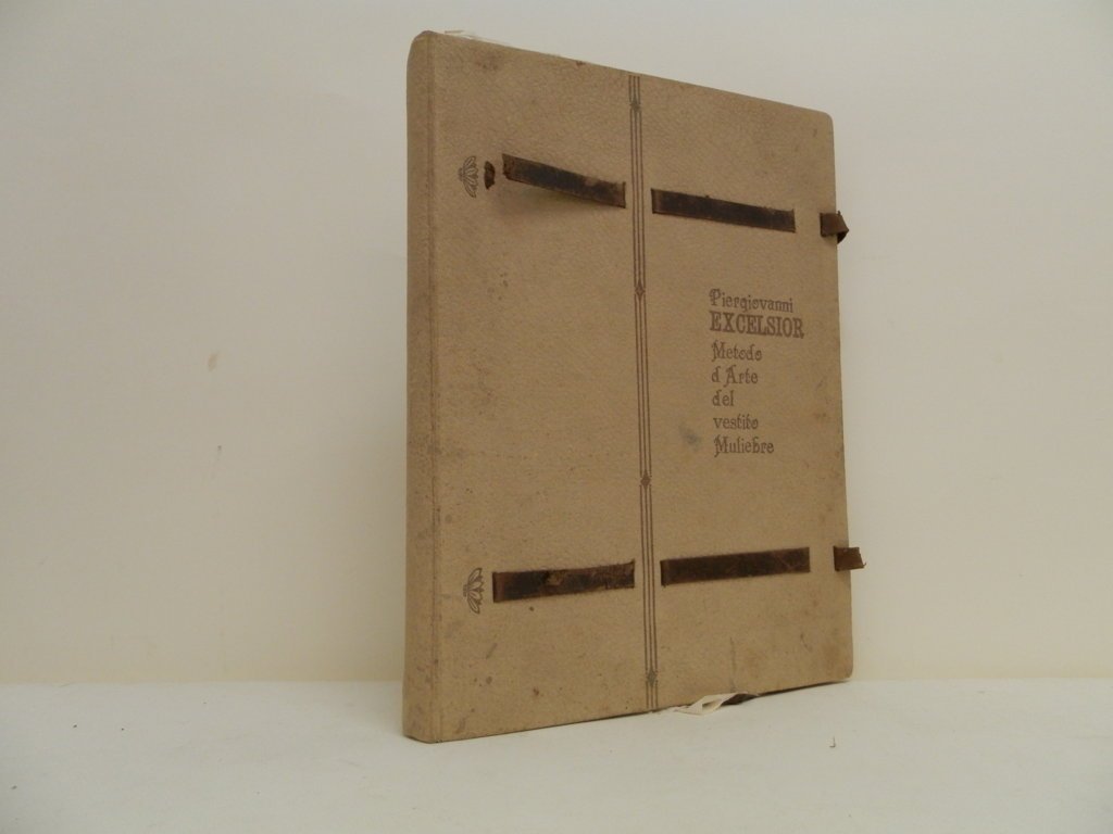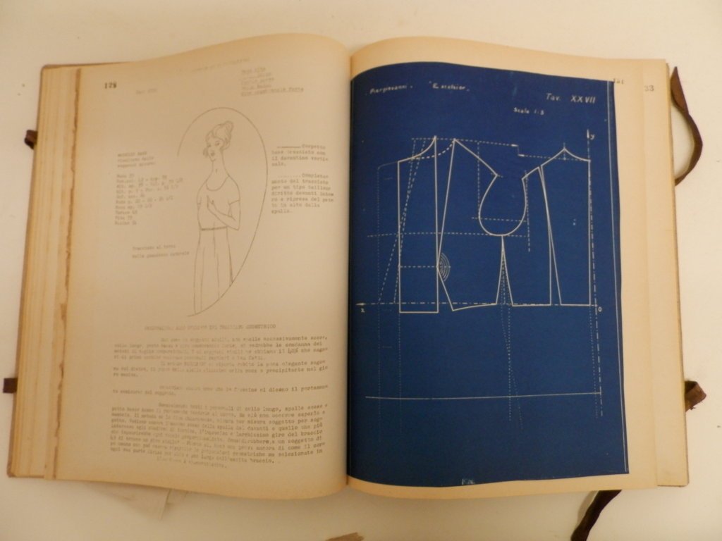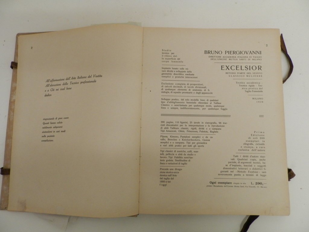 In folio, mm 400x300, pp. 391 + 110 figurini, 87 tavole tecniche tra cui 25 su carta speciale blu, 3 tavv. con vari figurini colorati; bella legatura editoriale in tela beige titoli in oro al piatto, due lacci in cuoio passanti nei piatti e ornamenti decò impressi. Eccellente conservazione, rinforzato l'interno della cerniera; all'interno conservati dei fogli copiativi da sartoria. Raro volume arricchita da uno stile tipografico visibilmente influenzato dalla moda futurista, (vedi a pagia 8 l'incipit "Prologo e non prefazione"in pubblicatain 200 esemplari in eliografia, ciclostile e stampa, a cura esclusiva dell'autore. "Ogni esemplare rilegato in tela L. 290 presso l'Accademia dell'Unione Mutua Sarti, via Visconti 15, Milano". Bruno Piergiovanni fu direttore dell'Accademia Italiana di Taglio dell'Unione Mutua Sarti di Milano. L'opera è così divisa: Tecnica Accademica - Tecnica Rigida - Tecnica Pratica. Le prime due sezioni occupano una parte minoritaria del volume.. *** TUTTI I NOSTRI LIBRI SONO VISIBILI PREVIO CONTATTO MAIL O TELEFONO NELLA NUOVA SEDE DI MILANO: LIBRERIA COSMOPOLIS, VIA JOMMELLI, 22. ***