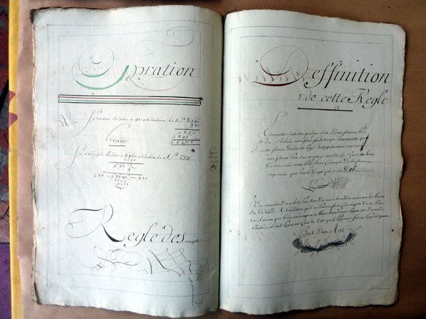 Un cahier cousu de 12 ff. (24 pages); format grand in folio (30x46cm) ; sur vergé règlé fort, bleuté; avec des arabesques et l'utilisation de différentes encres de couleurs. Les sujets de comptabilité concernent le plus souvent des financiers bordelais, agenais, marseillais. Les règles décrites sont "La règle de compagnie"; "La Compagnie à perte"; "à divers temps"; "règle de tare"; "à tant pour cent"; "règle d'escompte"; "règle de change". Manque de papier en première page avec un petit manque de texte sans gravité. ; la prémière page est piquée. trace de mouillure en pied sur 3ff. Sinon intérieur frais. Le premier exemple de calculs concerne une association pour le commerce de 200 nègres sur la côte de Guinée. Peu fréquent; voir les photos.