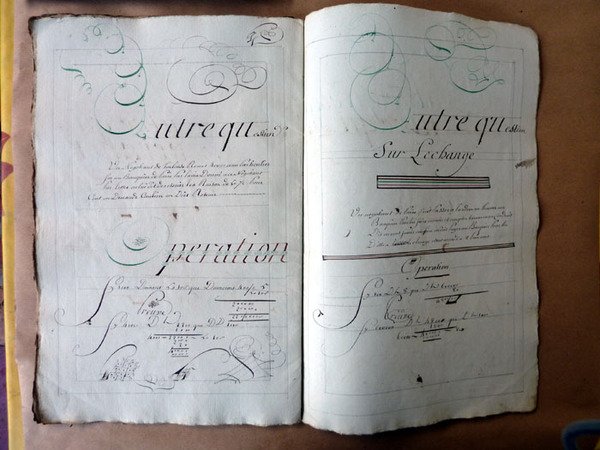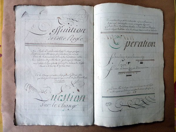 Exercice de Calligraphie du XVIIIème siècle ayant pour thème la comptabilité d'une association en société commerciale. Les exemples sont une entreprise de traffic d'esclave; une autre de commerce de blé; la question des monnaies étrangères.