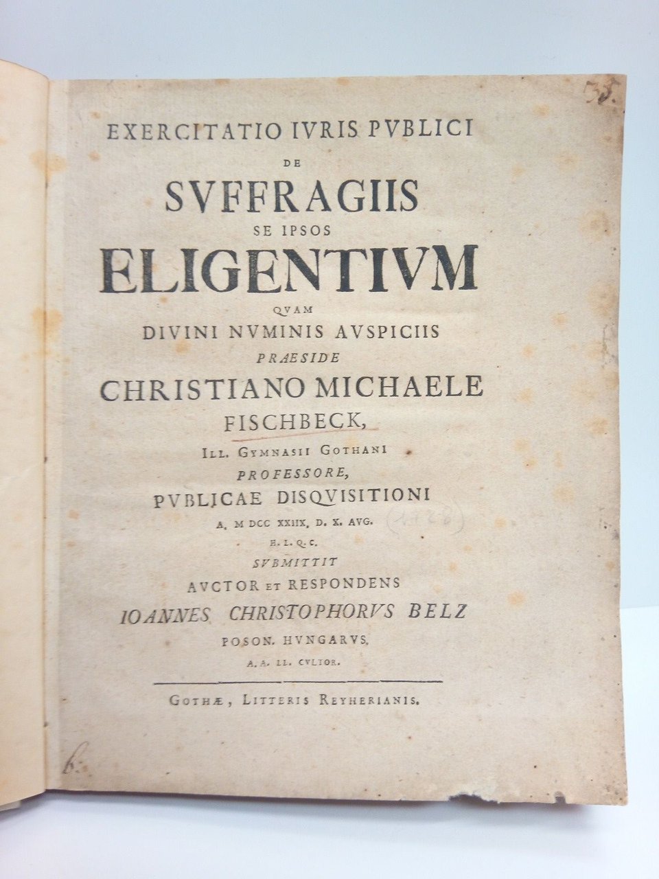 Exercitatio Iuris Publici de Suffragiis se ipsos Eligentium quam divini numinis auspiciis praeside Cristiano Michaele Fischbeck, Ill. Gymnasii Gothani Professore, Publicae Disquisitioni./ Submittit auctor et respondens, Ioannes Christophorus Belz, Poson. Hungarus / [dedicado] Serenissimo Principi ac Domino Domino Friderico II. Duci Saxoniae,.