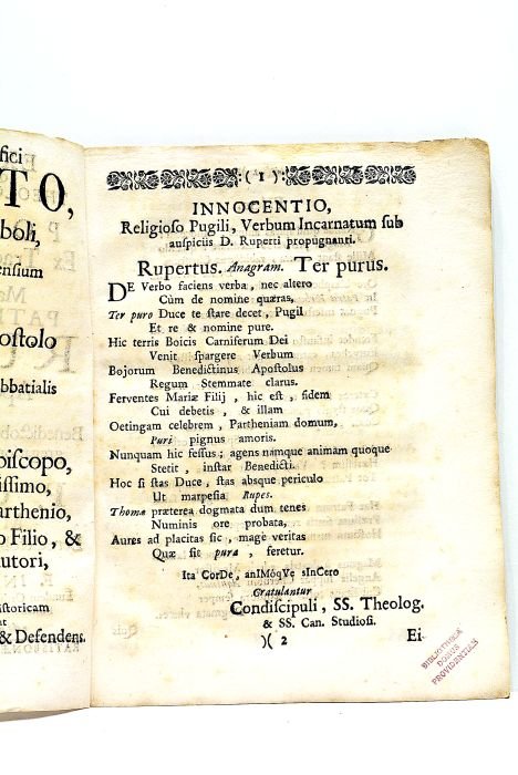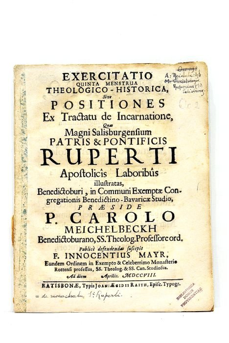 Exercitatio Quinta Menstrua Theologico-Historica, Sive Positiones Ex Tractatu de Incarnatione, quas Magni Salisburgensium Patris et Pontificis Ruperti Apostolicis Laboribus illustratas, Benedictoburi, in Communi Exemptae Congregationis Benedictino - Bavaricae Studio, praeside P. Carolo Meichelbeckh Benedictoburano, SS. Theolog. Professore ord. Publice defendendas suscepit F. Innocentius Mayr, Eundem Ordinem in Exempto et Celeberrimo Monasterio Rottenti professus, SS. Theolog. et SS. Can. Studiosus.