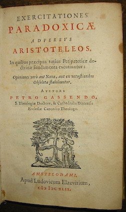 8vo (cm. 15,5), 16 cc.nn., 208 pp. Frontis. stampato in rosso e nero con marca tipografica. Legatura coeva in pergamena rigida con titolo ms. al ds. Ottimo esemplare. Trattato avverso la dottrina di Aristotele, prima opera del filosofo francese Gassendi. Seconda rara edizione, la prima fu pubblicata a Grenoble nel 1624. Willems, 1085.
