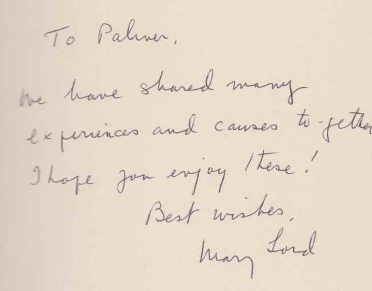 Light wear to DJ; INSCRIBED by co-author Mary Lord to front free endpaper. Typewritten letter from the inscribee Palmer Hoyt laid in, dated October 8, 1970. The Lords travelled extensively and had many adventures described partly tongue-in-cheek here, due to Mrs. Lord's career in the United Nations; B&W Illustrations; 8vo; 240 pages