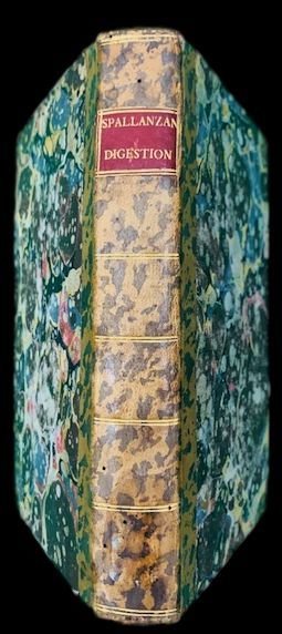 In 8°; (2), CXLIX, (2 b.), 320 pp. e (2), 54 pp. Elegante legatura coeva in mezza-pelle maculata con titolo su fascetta di pelle rossa e filetti in oro al dorso. Piatti foderati con bella carta marmorizzata coeva. Tagli rossi. Prima edizione francese tradotta da Jean Senebier (che curò anche la lunga introduzione), della prima opera e prima edizione in assoluto della seconda. Esemplare in ottime condizioni di conservazione. La prima opera è la prima edizione francese (si distingue dalla seconda edita nello stesso anno dal numero di pagine) di questo importante studio del celebre trattato del grande gesuita, biologo e naturalista originario di Scandiano (Reggio-Emilia) Lazzaro Spallanzani (Scandiano, 12 gennaio 1729 Pavia, 11 febbraio 1799), considerato il "padre scientifico" della fecondazione artificiale e che è ricordato soprattutto per aver confutato la teoria della generazione spontanea con un esperimento che verrà successivamente ripreso e perfezionato da Louis Pasteur. Le sue ricerche di fisologia gastroenterologica furono fondamentali nel dimostrare come il processo digestivo non consista, solo, nella semplice triturazione meccanica del cibo, ma anche in un processo di azione chimica a livello gastrico, necessario per permettere l'assorbimento dei nutrienti. Prandi p. 81: "Traduzione delle esperienze sulla digestione (primo volume delle 'Dissertazioni di fisica animale e vegetabile', Modena, 1780)." GM981 (Italian ed.): "Spallanzani confirmed earlier doctrines of the solvent property of the gastric juice and discovered the action of the saliva in digestion. He stated that gastric juice can act outside the body and can prevent or inhibit putrefaction.". First issued in Italian in 1780, of Spallanzanis (1729-1799) work on digestion; the first French edition was issued in Geneva in 1783. It was later translated into English (London, 1784, 1789). "Spallanzani confirmed earlier doctrines of the solvent property of the gastric juice and discovered the action of the saliva in digestion. He stated that gastric juice can act outside the body and can prevent or inhibit putrefaction. He obtains gastric juice by tying a sponge on a piece of string, then allowing it to be swallowed." - Garrison and Morton. La seconda opera (che si trova a volte rilegata con la prima per contiguità di argomento e perché di questa è, in qualche modo, una continuazione) è la prima edizione, non comune, di uno studio del il noto scrittore e botanico svizzero Jean Senebier (Ginevra, 6 maggio 1742 Ginevra, 22 luglio 1809) che in questo lavoro riassume e completa la conoscenza dei meccanismi della digestione. Lopera si avvalse anche del contributo dello stesso Spallanzani. Senebier, botanico di fama mondiale, è conosciuto per essere stato uno dei primi a studiare ed interpretare i processi chimici della fotosintesi clorofilliana. Estremamente interessato allopera di Spallanzani ne capì e seguì le intuizioni in campo chimico, applicandole e a volte estendendole. Nellopera qui presentata analizza limportanza della conoscenza dei meccanismi del succo gastrico in ambito chirurgico. Due prime edizioni in ottime condizioni di conservazione. Rif. Bibl.: per la prima opera ICCU IT\ICCU\PUVE\012056; per la seconda opera ICCU IT\ICCU\PUVE\012071.