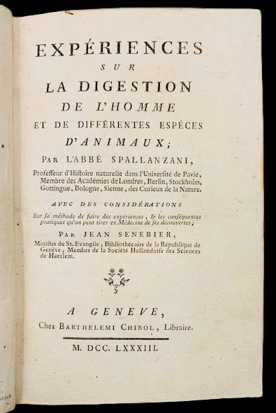 Expériences sur la Digestion de l'Homme et de différentes espèces d'animaux, par l'Abbé Spallanzani, avec des considérations sur sa méthode de faire des expériences, & les conséquences pratiques qu'on peut tirer en Médecine de ses découvertes.