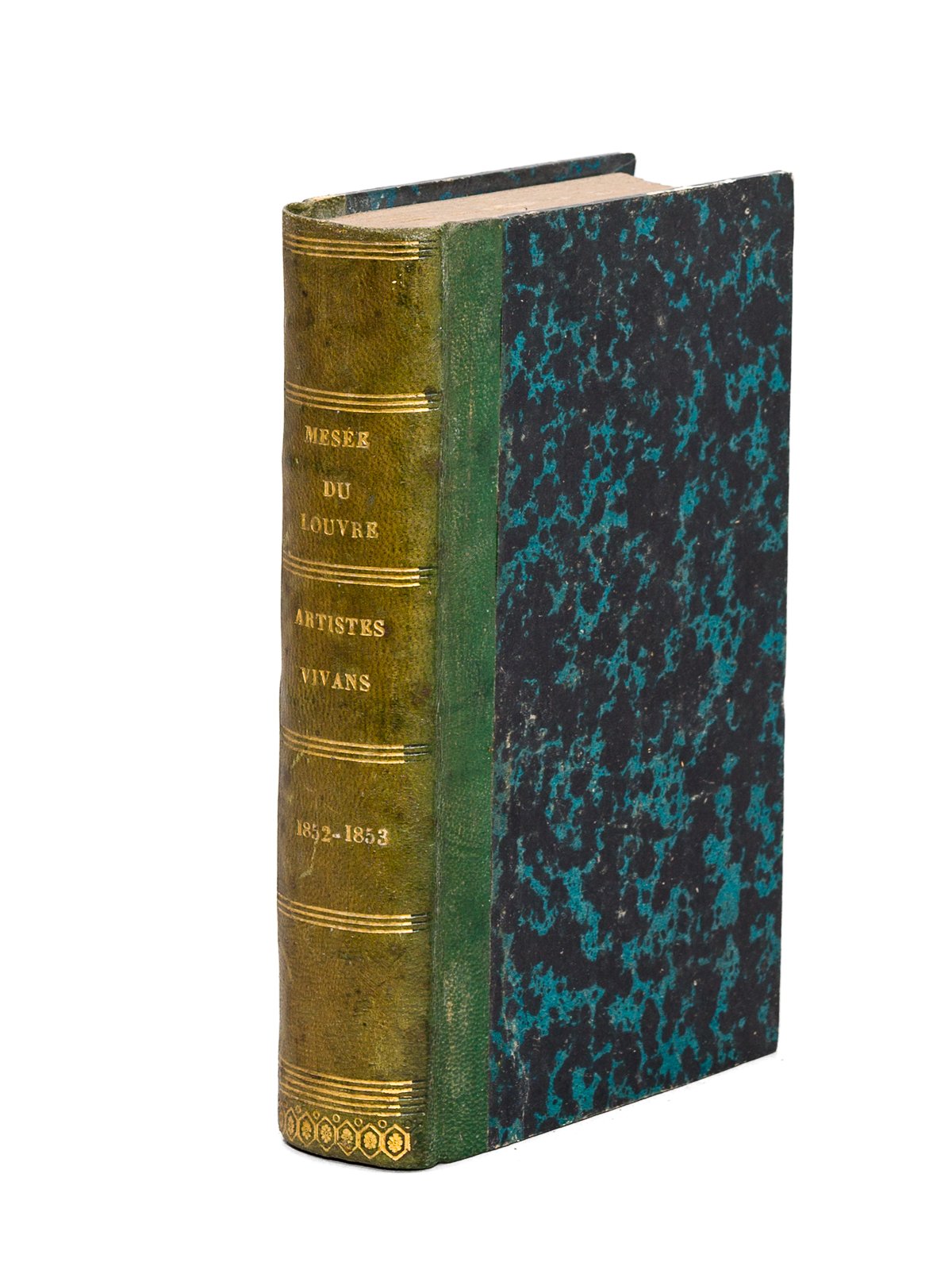 1 vol. in-12 reliure demi-basane verte, Vinchon, Fils et Successeur de Me Ve Ballard, Imprimeur des Musées Impériaux, Paris, 1852, 280 pp., 38 pp. et 2 ff. (Table Générale des Exposants avec plans), 296 pp., Rappel des titres complets : Explication des ouvrages de Peinture, Sculpture, Architecture, Gravure et Lithographie des Artistes Vivants exposés au Musée Royal le 1er avril 1852 [ Suivi de : ] Table Générale par Ordre Alphabétique des Artistes Exposants au Salon de 1852 [ Suivi de : ] Explication des ouvrages de Peinture, Sculpture, Architecture, Gravure et Lithographie des Artistes Vivants exposés au Musée Royal le 15 mai 1853 [ Suivi de : ] Liste des Artiste Vivants ayant obtenu des Récompenses antérieurement au 1er mai 1853 Réunion de 2 catalogues de l'Exposition au Musée Royal du Louvre, pour les Salons des années 1852 et 1853 et de la Table Générale des Exposants au Salon de 1852 ainsi que de la Liste des Artiste Vivants ayant obtenu des Récompenses antérieurement au 1er mai 1853. Bon état (mention "Mesée du Louvre" en dos, trace d'ancien ex-libris en garde).