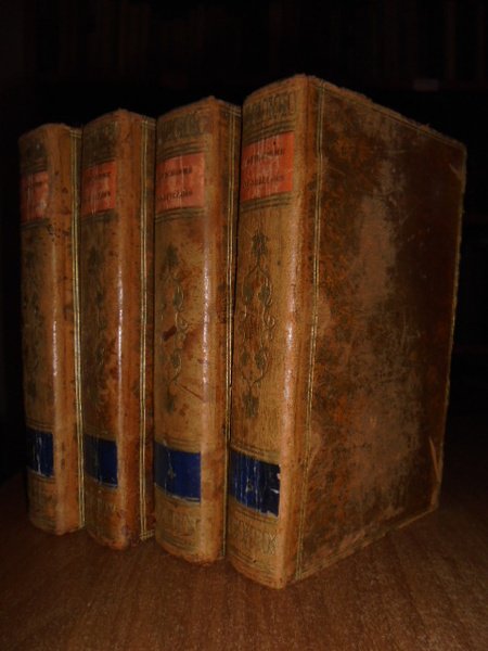 M. L' Abbé Ambroise Guillois. Le Mans, Julien Lanier/Charles Monnoyer, 1853- 1855. EXPLICATION Historique, dogmatique, morale liturgique et canonique du Catéchisme avec la réponse aux objections tirées des sciences contre la Religion. Curé au Mans. Septième édition entièrement refondue, augmentée d' un grand nombre d' articles et de toutes les décisions émanées du Saint-Siége, en 1851et 1852, sur les sujets les plus graves et les plus importants. 4 volumi in-8° antico, piena pelle coeva, duplice filetto in oro sui piani, fregi in oro ai dorsi e doppio tassello, taglio colorato. xx, 700 pp.; 689; 719; 742 pp. Ottimo esemplare. Uff. stanz. TV mob. nostro a sinistra
