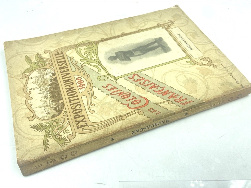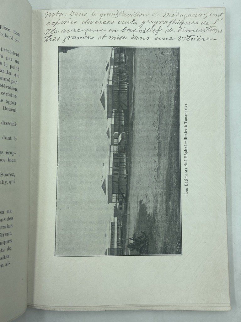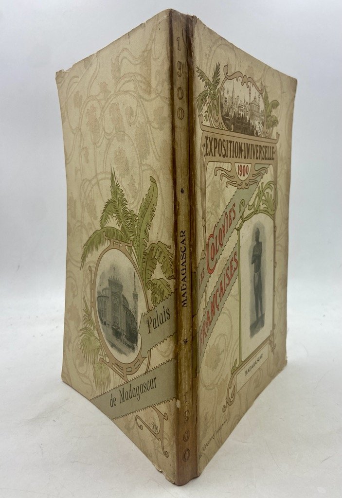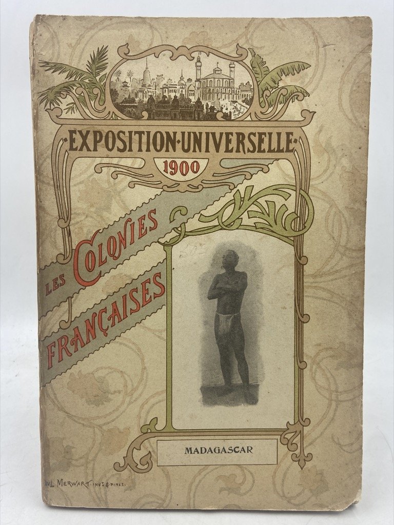 Brossura editoriale illustrata (piccolo restauro sulla cuffia superiore), cm 22.5 x 15.5, pp 206 (2) illustrate in nero. Testo in francese. Buona copia, con minimi difetti e restauri sulla brossura. Monografia edita in occasione dell’Esposizione Universale di Parigi del 1900, dedicata al padiglione del Madagascar e alla storia coloniale dell’isola rossa. In occasione dell’Expo fu eretto nella place du Trocadero un «Palais de Madagascar» di forma cilindrica, progettato dall’architetto Antony Jully in stile moresco, che attraverso un complesso percorso tra diorami, reperti, un grande panorama dipinto da L. Tinayre, e la ricostruzione di un villaggio malgascio (abitato durante le ore di visita da figuranti provenienti dall’isola) offriva al visitatore un completo ritratto della colonia, delle possibilità economiche, dell’operato dei colonizzatori. La copertina, illustrata da Paul Merwart (1855-1902), pittore ufficiale del Ministero della Marina e delle Colonie, tra fregi liberty e palmizi inquadra una fotografia di un uomo malgascio e due vedute del Palais de Madagascar, una piccola vignetta al tratto e una fotografia sul piatto posteriore. Il volume, che si apre col ritratto del governatore Gallieni, responsabile della fine del Regno del Madagascar e dell'esilio della sua ultima regina, Ranavalona III, presenta storia della colonizzazione, descrizione delle diverse etnie e caste, geografia, risorse naturali, industrie e commerci, lavori pubblici (ferrovie, strade, canali) ecc; in fine descrizione e statuto del Comité de Madagascar, e una bibliografia. L'apparato fotografico comprende ritratti degli ufficiali francesi e dei regnanti malagsci, immagini di taglio etnografico di uomini e donne dei diversi popoli indigeni, fotografie degli edifici coloniali, delle truppe locali inquadrate nell'esercito occupante, di cimiteri e monumenti funebri, di oggetti di artigianato locale. Su una tavola annotazione manoscritta a margine con notizie sul padiglione espositivo. Non comune, in particolare con la brossura editoriale.
