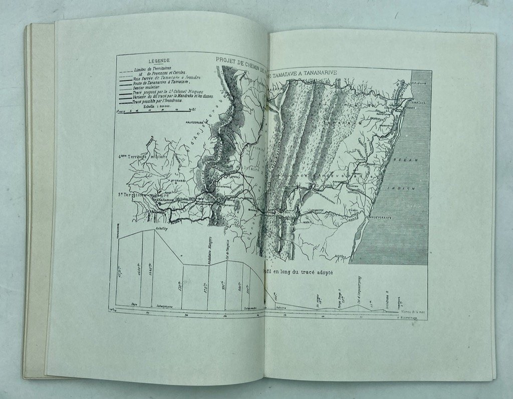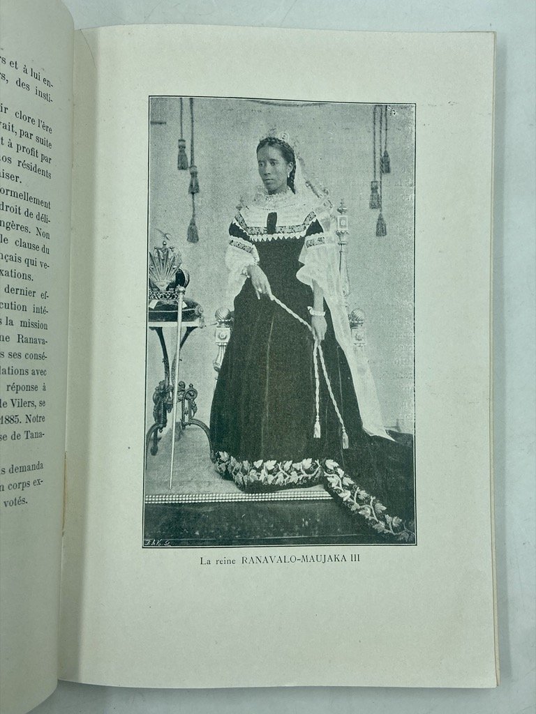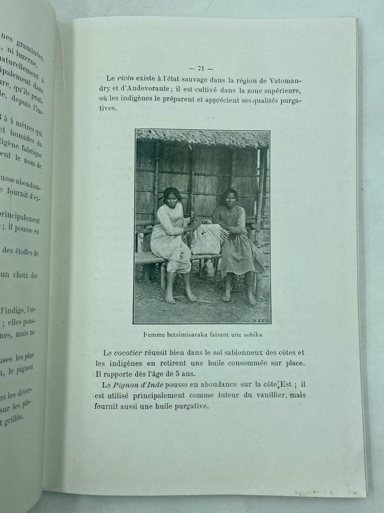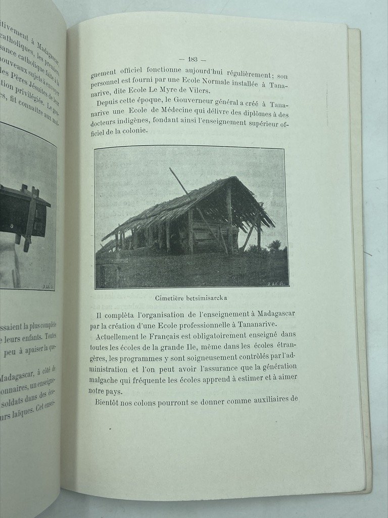 Brossura editoriale illustrata (piccolo restauro sulla cuffia superiore), cm 22.5 x 15.5, pp 206 (2) illustrate in nero. Testo in francese. Buona copia, con minimi difetti e restauri sulla brossura. Monografia edita in occasione dell’Esposizione Universale di Parigi del 1900, dedicata al padiglione del Madagascar e alla storia coloniale dell’isola rossa. In occasione dell’Expo fu eretto nella place du Trocadero un «Palais de Madagascar» di forma cilindrica, progettato dall’architetto Antony Jully in stile moresco, che attraverso un complesso percorso tra diorami, reperti, un grande panorama dipinto da L. Tinayre, e la ricostruzione di un villaggio malgascio (abitato durante le ore di visita da figuranti provenienti dall’isola) offriva al visitatore un completo ritratto della colonia, delle possibilità economiche, dell’operato dei colonizzatori. La copertina, illustrata da Paul Merwart (1855-1902), pittore ufficiale del Ministero della Marina e delle Colonie, tra fregi liberty e palmizi inquadra una fotografia di un uomo malgascio e due vedute del Palais de Madagascar, una piccola vignetta al tratto e una fotografia sul piatto posteriore. Il volume, che si apre col ritratto del governatore Gallieni, responsabile della fine del Regno del Madagascar e dell'esilio della sua ultima regina, Ranavalona III, presenta storia della colonizzazione, descrizione delle diverse etnie e caste, geografia, risorse naturali, industrie e commerci, lavori pubblici (ferrovie, strade, canali) ecc; in fine descrizione e statuto del Comité de Madagascar, e una bibliografia. L'apparato fotografico comprende ritratti degli ufficiali francesi e dei regnanti malagsci, immagini di taglio etnografico di uomini e donne dei diversi popoli indigeni, fotografie degli edifici coloniali, delle truppe locali inquadrate nell'esercito occupante, di cimiteri e monumenti funebri, di oggetti di artigianato locale. Su una tavola annotazione manoscritta a margine con notizie sul padiglione espositivo. Non comune, in particolare con la brossura editoriale.