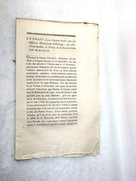 Extrait d'une lettre écrite par un Officier Municipal d'Orange: au Patriote Soulet, à Paris, le 8 janvier l'an 4ème de la liberté.