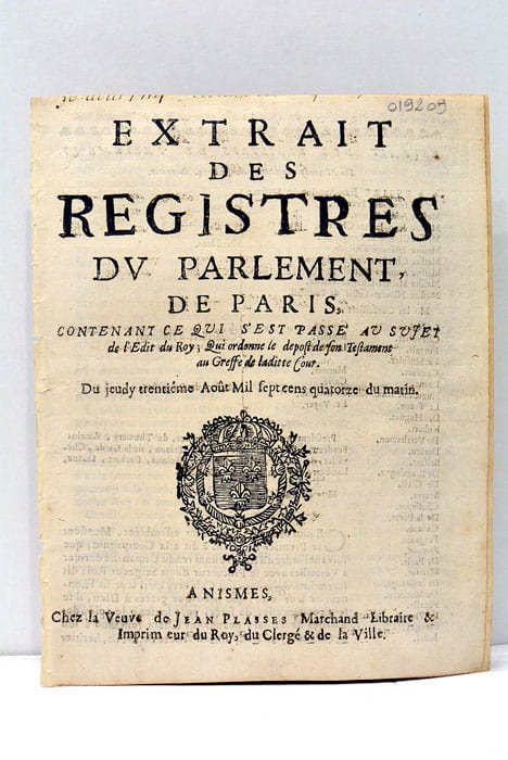 EXTRAIT DES REGISTRES du Parlement de Paris, contenant ce qui s'est passé au sujet de l'Edit du Roy; qui ordonne le depôt de son Testament au Greffe de laditte Cour.