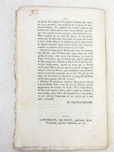 1 brochure in-8, A Bordeaux, Chez Racle, 1815, 8 pp. Rare exemplaire de l'important discours de Chateaubriand publié dans le "Journal des Débats politiques et littéraires", et qui sera édité par la suite par Le Normant. Etat très satisfaisant (premiers ff. un peu frottés) pour cette vraie rareté bibliographie.
