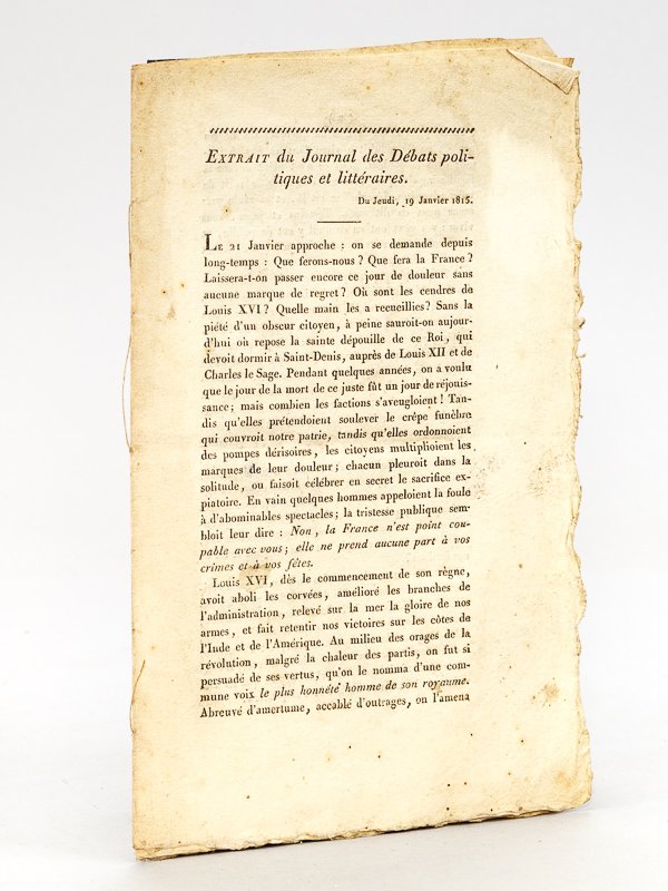Extrait du Journal des Débats politiques et littéraires du Jeudi 19 Janvier 1815 [ Impression bordelaise du texte de Chateaubriand sur "Le 21 Janvier" à propos de la commémoration de la mort de Louis XVI].