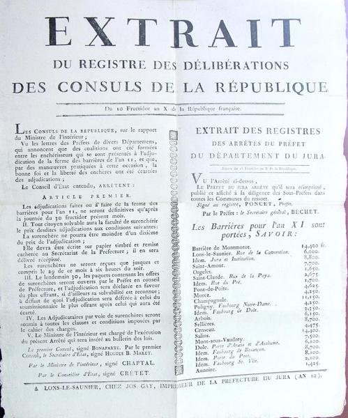 Jos. GAY, Lons-le-Saunier, An 10. Encart papier 41,5 x 51 cm. Non massicoté. Très frais.Sont concernés Montmorot, Lons-le-Saunier, Saint-Amour, Orgelet, Saint-Claude, Pont-de-Poîte, Morez, Champagnole, Poligny, Arbois, Sellières, Censeau, Salins, Mont-sou-Vaudrey, Dole et Annoire.