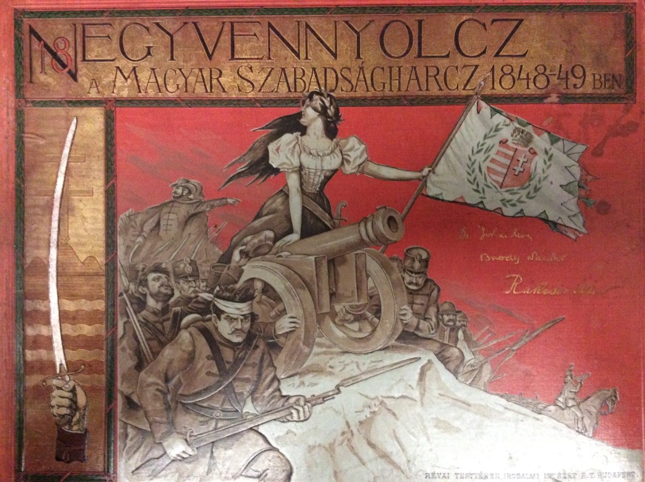 Album in-8 gr. (mm. 260x 335), bella legatura in tela editoriale a colori, riccamente figurata al piatto anter., decoraz. a secco al piatto poster. (con piccole macchie; dorso restaurato), pp. (4),476. Il volume è molto ben illustrato nel testo da centinaia e centinaia di immagini in bianco e nero che raccontano la storia della guerra di indipendenza ungherese nel 1848/1849; il testo, in lingua magiara, è ricco di documenti, con la riproduzione di manoscritti originali, reliquie, ecc. Esemplare molto ben conservato.