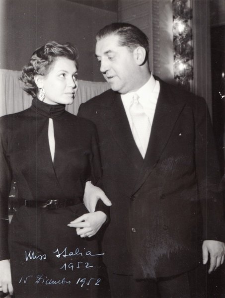 Ezio Radaelli. (Milano, 1924 – Roma, 2005). Personaggio televisivo e impresario , organizzatore negli anni '50 di Miss Italia. Fotografia originale con Eloisa Cianni vincitrice Miss Italia 1952.