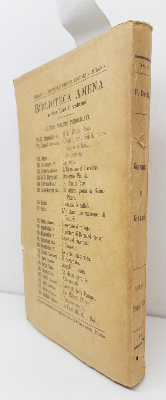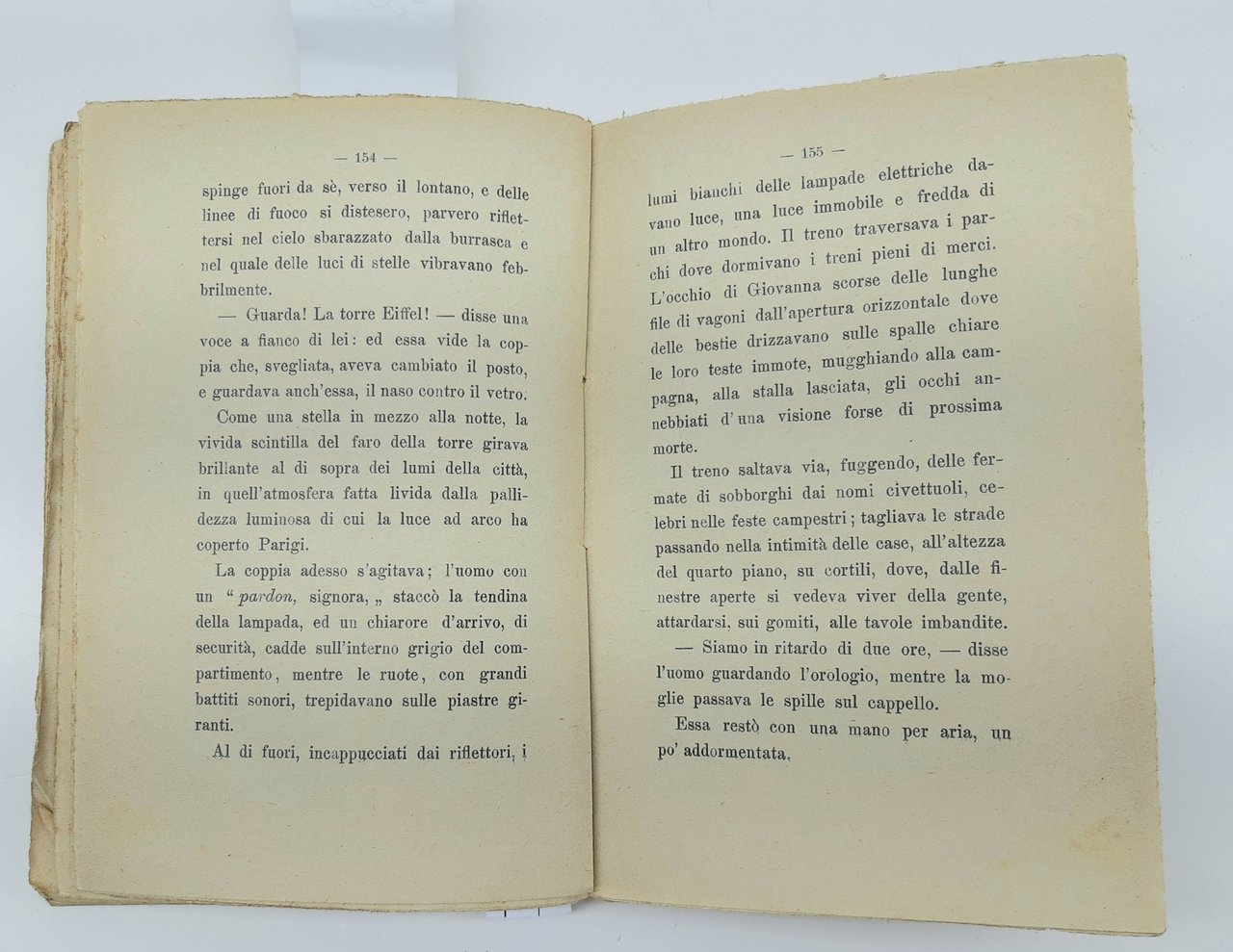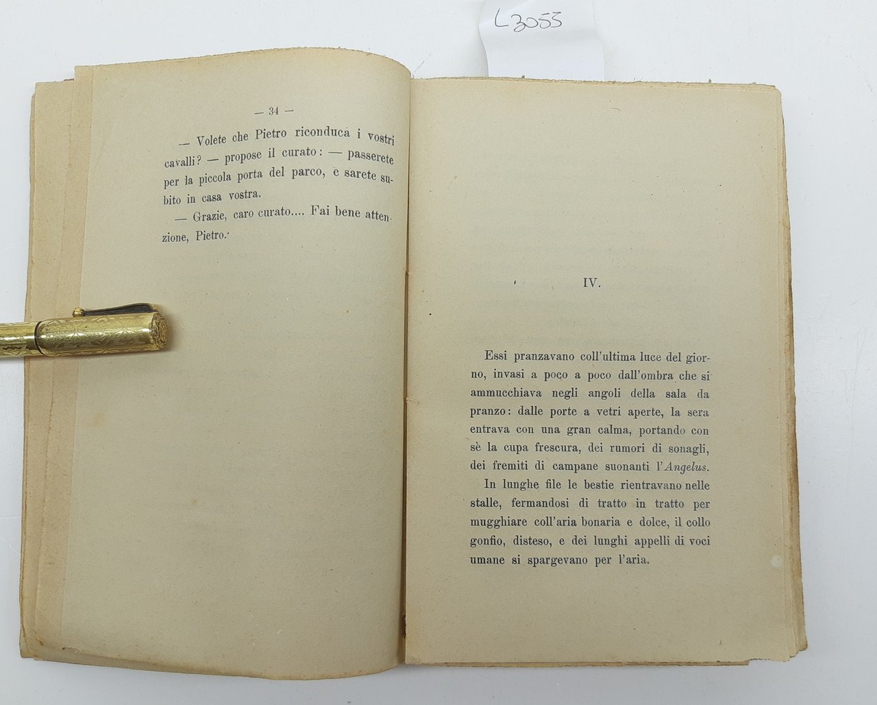 legatura morbida editoriale con una piega all'angolo superiore del piatto anteriore, fioriture e bruniture diffuse ai piatti e al dorso, dorso con uno strappo nella zona mediana e piccoli fori al margine inferiore, tagli irregolari bruniti con fioriture diffuse, firma di possesso al piatto anteriore antiporta e frontespizio, etichette di catalogazione all'antiporta, di possesso al frontespizio, una piega all'angolo superiore che va ad interessare le pagine interne fino a pagina 10, fioriture diffuse alle pagine interne che non impediscono la lettura, legatura molto allentata, la pagina 99 a pagina 110 e da pagina 179 a pagina 190 a fogli sciolti, pagine interne brunite numero pagine 267 + pubblicità dimensioni cm 19,5 * 14, libro deformato al dorso