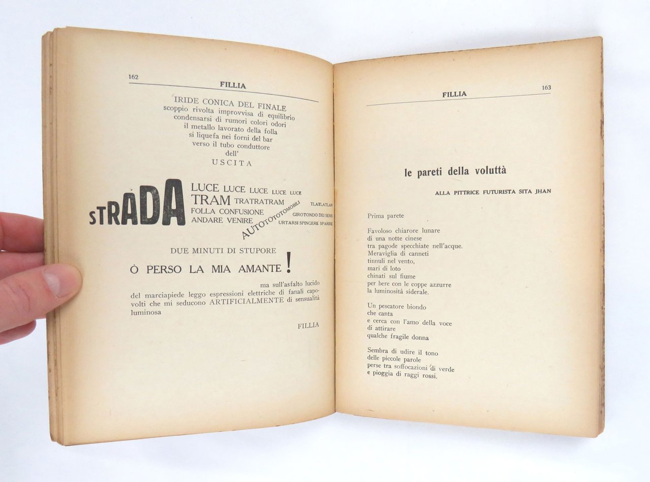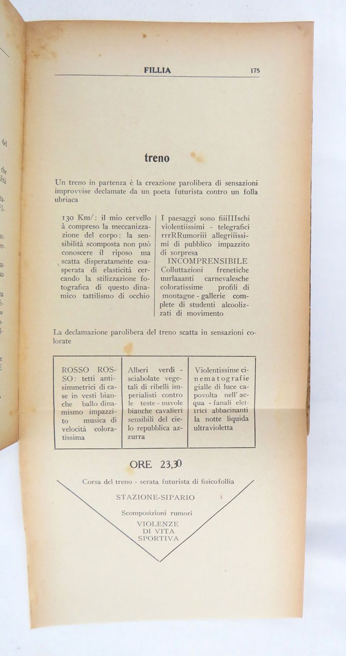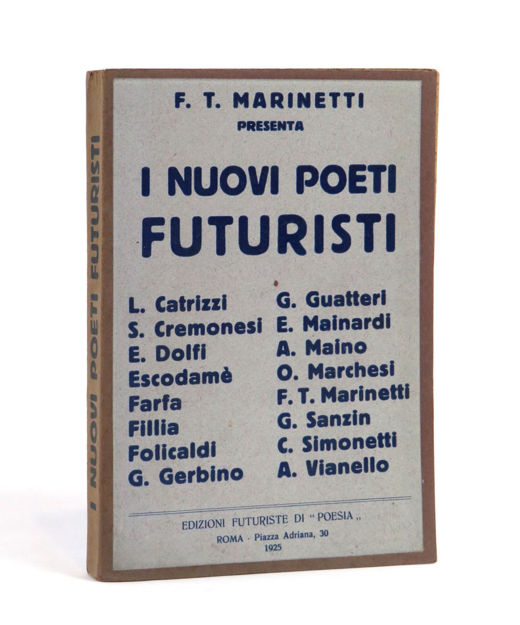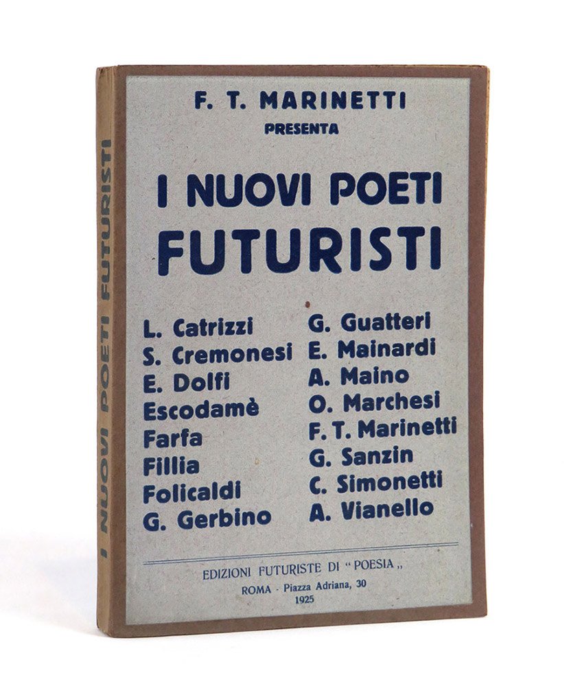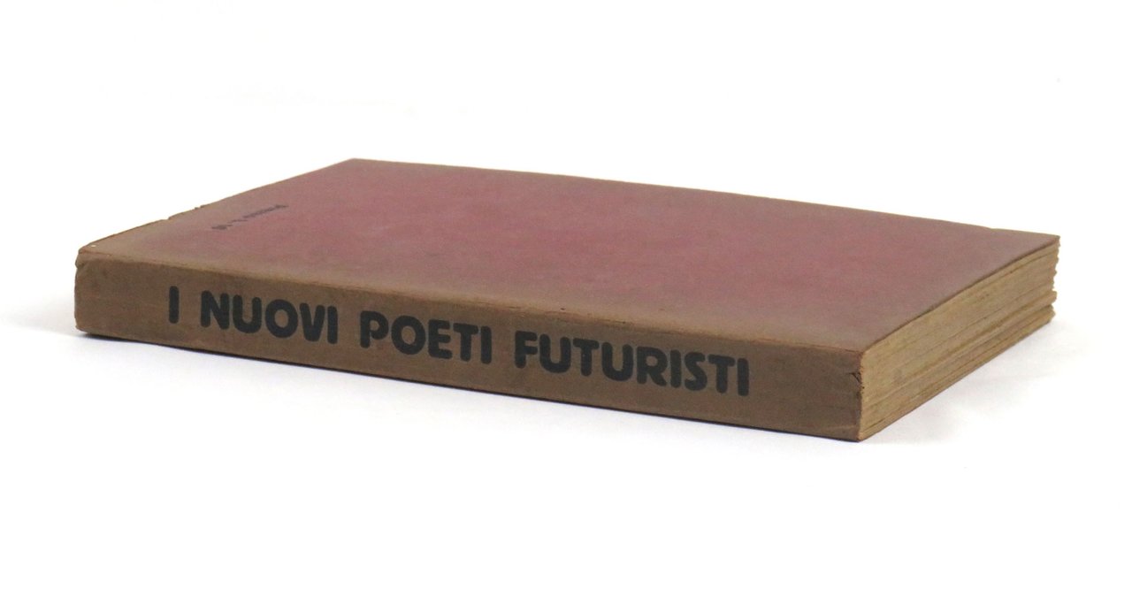 LIBROPrima edizione.Esemplare piuttosto fresco e pulito, sia alla copertina che alle pagine interne; piccola mancanza al piede del dorso, leggermente scolorito così come i bordi dei piatti, come normale; pagine interne inusualmente chiare (lacerazioni senza pedite al piede delle carte 29-32); in condizioni quasi ottime.Straordinaria antologia che raccoglie poesie, versi paroliberi e vere e proprie tavole parolibere, molte di esse in edizione originale. Abbondano le sperimentazioni tipografiche, e impressionanti sono le tavole ripiegate, due per Fillia, quattro fronte-retro per Marinetti e la giustamente famosa «Treni in corsa» di Cesare Simonetti, che interamente svolta misura mezzo metro. Segue di un anno il primo congresso futurista italiano e prepara il lancio della generazione del secondo futurismo. -- «Questo volume “I nuovi poeti futuristi” rivelerà al mondo i poeti futuristi Loris Catrizzi, Silvio Cremonesi [sic, per Cremonese], Mario Dolfi, Escodame [sic, senza accento], Farfa, Fillia, Alceo Folicaldi, Giovanni Gerbino, Giuseppe Guatteri, Angelo Maino, Enzo Mainardi, Oreste Marchesi, Bruno Sanzin, Cesare Simonetti, Alberto Vianello. Di questi 15 poeti 8 sono paroliberi. [.] Ad altri giunti come me sulle vette della celebrità questi giovani poeti potrebbero incutere il terrore di una concorrenza. Ciò non può accadermi poiché sono il loro vero coetaneo. [.] Perciò io vi presento in questo volume fra i nuovi poeti futuristi il giovanissimo F.T. Marinetti» (dalla prefazione). -- «La selezione delle poesie fu curata [da Marinetti e] da Fillia, e le spese di stampa furono pagate da Farfa, mentre il vol. fu distribuito dalla Ditta A. Mazzetti di Torino [.]. Raro» (Cammarota).Bibl.: Cammarota, Futurismo, Libri di aa. vv., 30; Id., Marinetti, 113