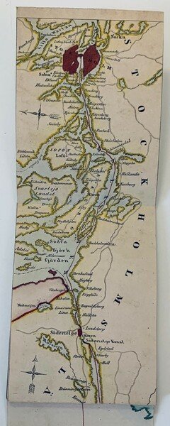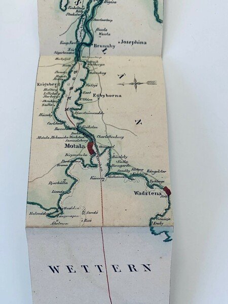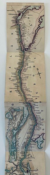 In oblungo; (36) pp. di testo e una grande tavola più volte ripiegata con ai lati del corso del Reno i più importanti edifici toccati dal grande fiume, con l'indicazione del nome del monumento, castello paesaggio naturale ed il luogo di appartenenza. Qualche piccolo strappetto al margine alto bianco della carta, ininfluente e per il resto, nel complesso, in buone-ottime condizioni di conservazione. Non comune senconda edizione, dopo la prima del 1846.