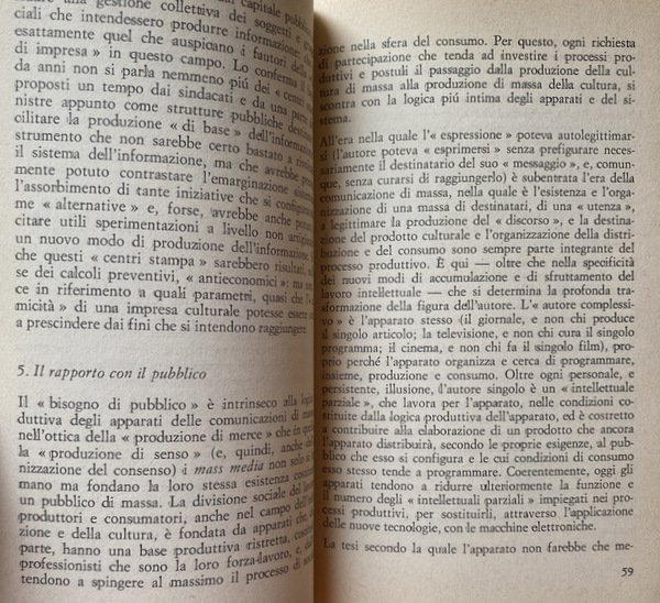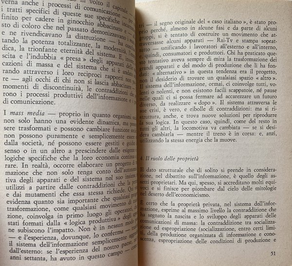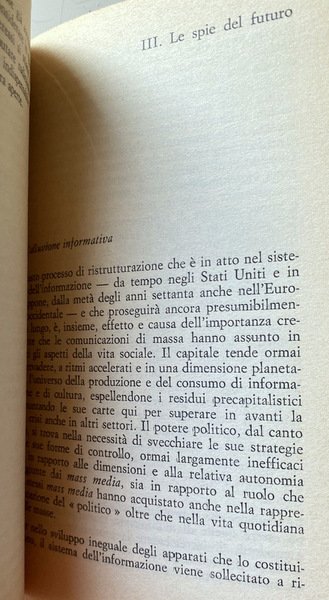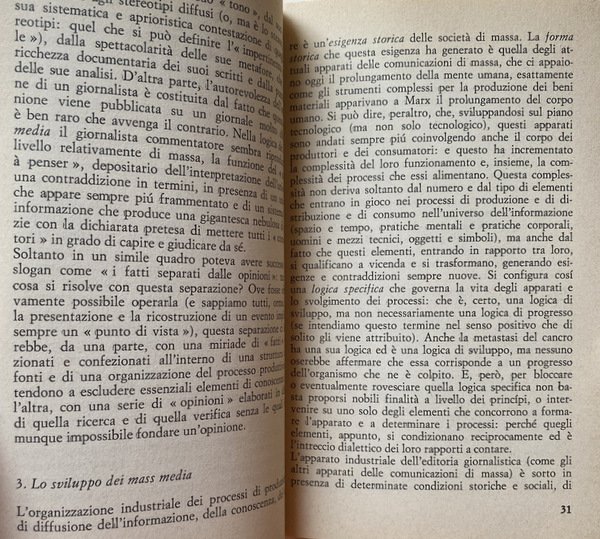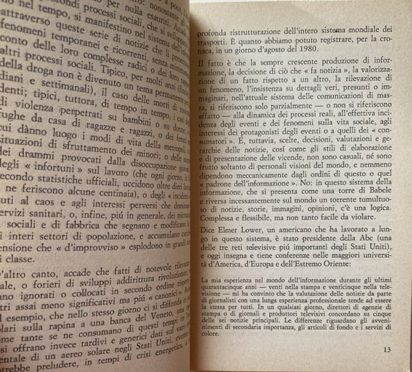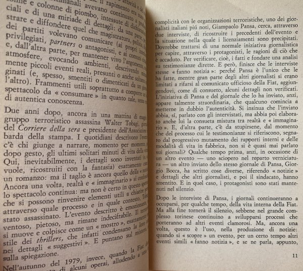 Soggetti: Politica, Società, Informazione, Stampa, Editoria, Giornalismo, Carta stampata, Quotidiani, Giornali, Mass Media, Reportage, Fonti, Industria culturale, Ideologie politiche, Partiti politici, Proprietà, Grandi Editori, Distribuzione, Giornalisti, Veline, Guerre, Partitocrazia, Destra, Sinistra, Potere, Strumenti, Voci, Pluralismo, Libertà, Controinformazione, Mercato, Diritto, Lavoro, Capitale, Socialismo, Democrazia, Cronaca, Attualità, Sistema politico, Anni Settanta, Brigate Rosse, Rapimento, Aldo Moro, Pezzi giornalistici, Tecnologia, Capitalismo, Consumismo, Comunicazione, Prodotti editoriali, Lettori, Pubblico, Finanziamenti statali, Stampa alternativa, Apparato, Referenze, Fiat, Pansa, Corriere della Sera, Repubblica, L'Unità, Il Manifesto, Rapporti di produzione, Marxismo, Critica, Analisi, Saggistica, Notizie, Spionaggio, Servizi segreti, Fonti fidate, Citazioni, Interviste, RAI, televisione, Video, Immagini, Delitti, Misteri italiani, Scoop giornalistici, Gadgets, Film, Cinema, Spettacolarizzazione, Strumentalizzazione, Fenomeni sociali, Fotografia, Eventi, Norme, Regole, Etica professionale, Segreto, Censura, Autocensura, Elzeviri, Endorsement, Dittature, Controllo, Quarto potere, Condizionamenti, Anni di piombo, Walter Tobagi, Modelli, Principi, Audience, Contraddizioni, Diffusione, Cultura, Successi editoriali, Sessantotto, Contestazione, Linguaggio, Gergo, Politichese, Burocrazia, Apparati, Ricerca, Dossier, Indagini, Agenzie, Multinazionali, ANSA, TASS, ABC, BBC, United Press, Associated, France-Press, Guerra fredda, Dibattiti, Europa, Russia, Cina, Stati Uniti, Libri Vintage Fuori catalogo, Consenso, Nuove strategie informative, Sociologia, Privacy, McLuhan, Feticismo tecnologico, Produzione di storia, Memoria, Radio, Divulgazione, Conoscenza, Critici televisivi italiani, Selezione, Logica produttiva, Scandali, Linea politica, Indro Montanelli, Reperimento delle fonti, Imparzialità, Stesura, Uso delle inquadrature, Suono, Montaggio del pezzo, Servizio, Dino Buzzati, Max David, Luigi Romersa, Mario Soldati, Cesco Tomaselli, Paolo Monelli, Orio Vergani, Antifascismo, Resistenza, Immagini, Esteri, Politics, Society, Information, Press, Publishing, Journalism, Print media, Newspapers, Newspapers, Sources, Cultural industry, Political ideologies, Political parties, Property, Large publishers, Distribution, Journalists, Tissue papers, Wars, Partitocracy, Right, Left, Power, Tools, Voices, Pluralism, Freedom, Counter information, Market, Law, Work, Capital, Socialism, Democracy, News, Current affairs, Political system, Seventies, Red Brigades, Kidnapping, Journalistic pieces, Technology, Capitalism, Consumerism, Communication, Products Editorials, Readers, Audience, Government funding, Alternative press, Apparatus, References, Production relations, Marxism, Criticism, Analysis, Nonfiction, Espionage, Secret services, Trusted sources, Quotes, Interviews, Images, Crimes, Italian mysteries, Spectacularization, Instrumentalization, Social phenomena, Photography, Events, Norms, Rules, Professional ethics, Censorship, Self-censorship, Dictatorships, Control, Fourth estate, Conditioning, Years of lead, Models, Principles, Audience, Contradictions, Diffusion, Culture, Editorial successes, Sixty-eight, Contestation, Language, Jargon, Politics, Bureaucracy, Apparatus, Research, Investigations, Agencies, Multinationals, Cold war, Debates, Europe, China, United States, Out of print books, Consent, New strategies, Sociology, Technological fetishism, History production, Memory, Dissemination, Knowledge, Italian television critics, Selection, Production logic, Scandals, Political line, Sourcing, Impartiality, Drafting, Use of shots, Sound, Editing of the piece, Antifascism, Resistance, Images, Foreign