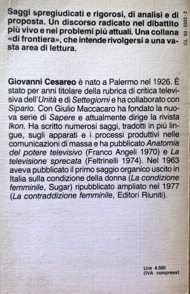 Giovanni Cesareo, Palermo, 1926-2015. È stato per anni titolare della rubrica di critica televisiva dell'Unità e di Settegiorni e ha collaborato con Sipario. Con Giulio Maccacaro ha fondato la nuova serie di Sapere e ha diretto la rivista Ikon. Ha scritto numerosi saggi, tradotti in più lingue, sugli apparati e i processi produttivi nelle comunicazioni di massa e ha pubblicato Anatomia del potere televisivo (Franco Angeli 1970) e La televisione sprecata (Feltrinelli 1974). Nel 1963 ha pubblicato il primo saggio organico uscito in Italia sulla condizione della donna (La condizione femminile, Sugar) ripubblicato ampliato nel 1977 (La contraddizione femminile, Editori Riuniti).