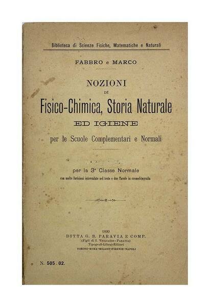 Autore: Fabbro & Marco Titolo: Nozioni di FIsico-Chimica, Storia Naturale ed Igiene Sottotitolo: Per le scuole Complementari e Normali - Con molte incisioni intercalate nel testo e due Tavole in cromolitografia. Edizione: Ditta G. B. Paravia e comp. 1899 Dimensioni: 14 x 21 cm c.a. Copertina: Brossura Condizioni: Ottime come da foto