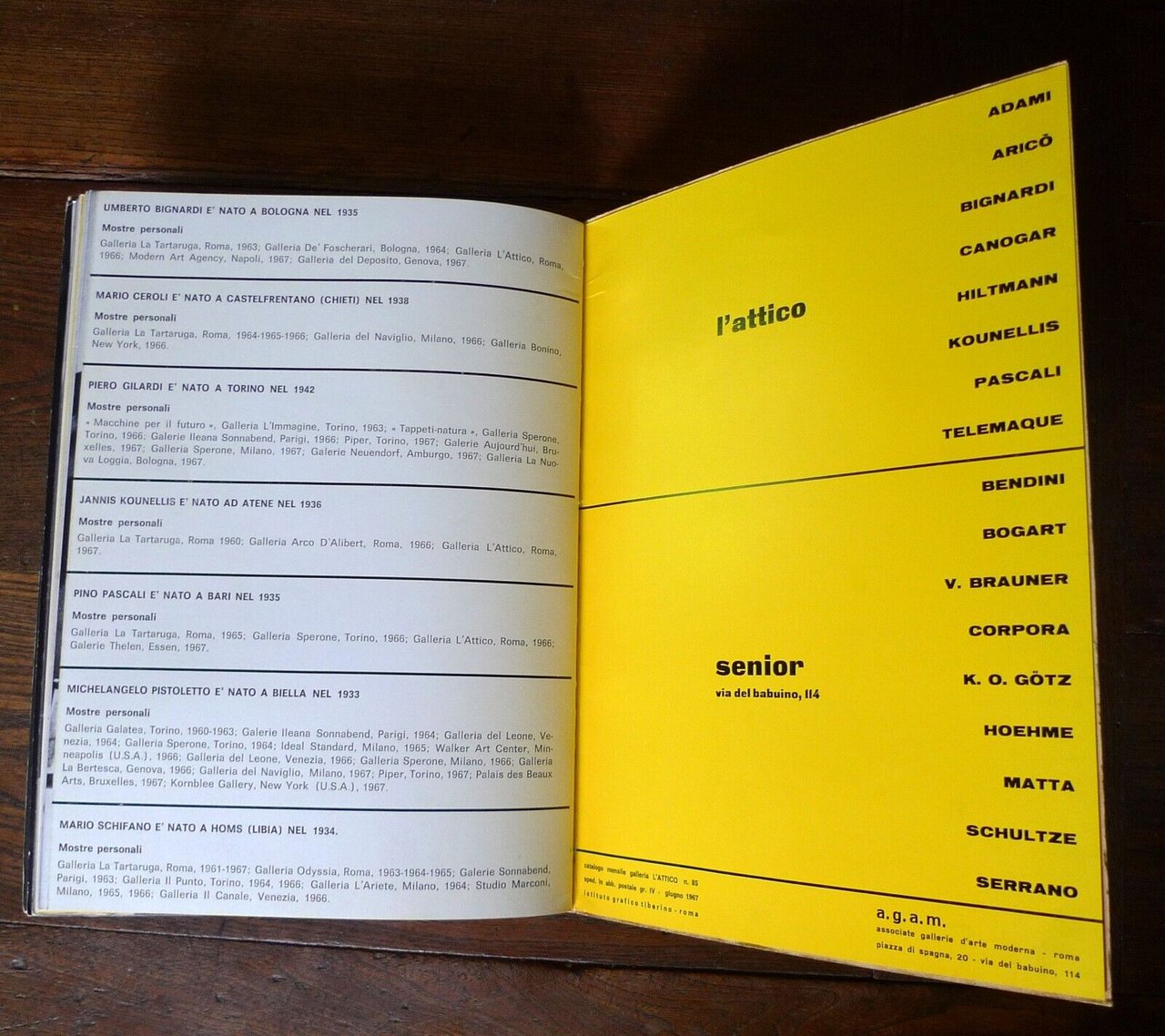 L’ATTICO 66 67Raccolta completa, a cura della galleria L'Attico di Roma, dei cataloghi delle prime sei mostre nella sededi piazza di Spagna con la nuova gestione diFabio Sargentini.Contiene i 6 cataloghi nel formato originale.L'Attico / Istituto Grafico Tiberino, Roma 1966-1967,brossura,30x21,5 cm., pagine non numerate,illustrazioni in nero e a colori,g.700