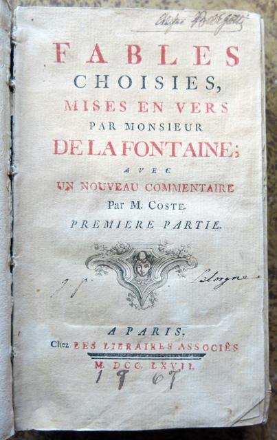 Chez Les Libraires Associes, Paris, 1767. Due parti in un unico volume in 8vo lungo (cm 10 x 17 circa), front. in rosso / nero, pp. 270 (con la Table des Fables), leg. coeva ma forse non orig. con dorso e punte in perg., piatti rivestiti in cartonato. Celebri le favole dello scrittore e poeta francese La Fontaine (Château Thierry, 1621 – Parigi, 1695) con protagonisti gli animali. Uniformemente ingiallito e con alcune tracce del tempo ma nell'insieme buono.