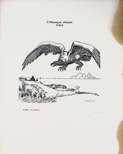 Abel Jules Faivre (Lione 1867 - Nizza 1945) Litografia originale firmata a mano dall'artista.Dimensioni: 56 x 38,5 cmCon certificato di autenticità C.O.A.Ingiallimento laterale come da foto.Esemplare numero 62/250 La raccolta di litografie umoristiche del caricaturista francese Abel Faivre (Lione 1867-Nizza 1945), andata a confluire nel volume Jours de guerre,fu pubblicata in due tomi tra il 1915 e il 1919. Con il procedere del conflitto, l'opinione pubblica di tutti i paesi coinvolti,che aveva dapprima affrontato tale evento con ottimismo, mutò rapidamente opinione sino a considerare la guerra, senza mezzi termini,come un avvenimento rovinoso. In tale contesto, le vignette satiriche di guerra possedevano un potente effetto catartico,adempivano un ruolo sociale irrinunciabile, fornendo una valvola di sfogo all’incombere dal più cupo pessimismo. Abel Jules Faivre (Lyon 1867 - Nizza 1945) Originale Lithographie vom Künstler von Hand signiert.Abmessungen: 56 x 38,5 cmMit Echtheitszertifikat C.O.A.Seitliche Vergilbung wie auf dem Foto.Kopieren Sie die Nummer 62/250 Die Sammlung humorvoller Lithographien des französischen Karikaturisten Abel Faivre (Lyon 1867-Nizza 1945), die in den Band Jours de guerre floss,es wurde zwischen 1915 und 1919 in zwei Bänden veröffentlicht. Im Verlauf des Konflikts wurde die öffentliche Meinung in allen beteiligten LändernWer dieses Ereignis anfangs mit Optimismus konfrontiert hatte, änderte schnell seine Meinung, um den Krieg ohne Zweifel zu betrachten.wie ein ruinöses Ereignis. In diesem Zusammenhang hatten die satirischen Kriegskarikaturen eine starke kathartische Wirkung.Sie erfüllten eine unverzichtbare soziale Rolle und bildeten ein Entlastungsventil gegen den dunkelsten Pessimismus. Abel Jules Faivre (Lyon 1867 - Nice 1945) Lithographie originale signée à la main par l'artiste.Dimensions: 56 x 38,5 cmAvec certificat d'authenticité C.O.A.Jaunissement latéral comme sur la photo.Copie numéro 62/250 La collection de lithographies humoristiques du caricaturiste français Abel Faivre (Lyon 1867-Nice 1945), qui allait se fondre dans le volume Jours de guerre,il a été publié en deux volumes entre 1915 et 1919. À mesure que le conflit progressait, l'opinion publique de tous les pays impliqués,qui avait d'abord fait face à cet événement avec optimisme, a rapidement changé d'avis pour envisager la guerre, en termes non équivoques,comme un événement ruineux. Dans ce contexte, les caricatures de guerre satiriques ont eu un puissant effet cathartique,ils remplissaient un rôle social indispensable, fournissant une soupape de décharge du pessimisme le plus sombre. Abel Jules Faivre (Lyon 1867 - Nice 1945) Original lithograph signed by hand by the artist.Dimensions: 56 x 38.5 cmWith certificate of authenticity C.O.A.Lateral yellowing as in the photo.Copy number 62/250 The collection of humorous lithographs by the French caricaturist Abel Faivre (Lyon 1867-Nice 1945), which went to flow into the volume Jours de guerre,it was published in two volumes between 1915 and 1919. As the conflict progressed, public opinion in all the countries involved,who had initially faced this event with optimism, quickly changed his opinion to consider the war, in no uncertain terms,like a ruinous event. In this context, the satirical war cartoons had a powerful cathartic effect,they fulfilled an indispensable social role, providing a relief valve from the darkest pessimism.