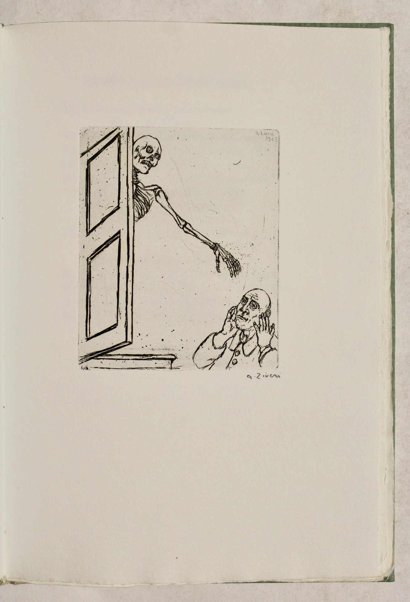 In folio (mm 275x190); pagg. 33, (2), con 10 pagine bianche; 6 belle acquaforti n.t. Mezza pergamena editoriale con titolo impresso in oro al dorso, piatti e astuccio in cartoncino verde. <BR>Il volume, con testo francese, impresso a mano su carta di Fabriano, contiene le favole La Morte et le Malheureux con incisione di A. Ziveri, Testament expliqué pae Esope con incisione di A. Ciarrocchi, La Vieille et les deux Servantes con incisione di A. Manfredi, Le Vieillard et l'Ane con incisione di C. Mattioli, Les deux Pigeons con incisione di M. Maccari e La Tortue et les deux Canards con incisione di D. Rossoni. Il volume è stato stampato per la libreria antiquaria Prandi in 105 esemplari di cui il presente è il n° XVIII e appartiene pertanto a una tiratura speciale. Infatti, come recita il colophon, 75 esemplari sono numerati 1-75, 25 esemplari sono cifrati I-XXV, 5 esemplari marcati A-E sono destinati al deposito legale. Ottimo esemplare, con barbe.<BR>