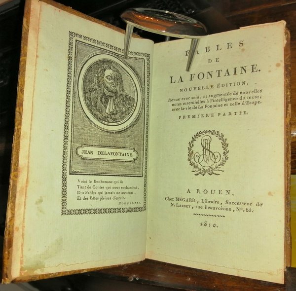 In-12 (17 cm) 2 tomi in uno(1) c. (ritratto) (4) LVI 142, (4) 251 (1). Finalini xilografici relativi alle favole. Mezza pelle con piatti rivestiti di carta marmorizzata. Secondo tomo e prima parte del primo in carta azzurra. Bell'esemplare. French language. Lingua francese